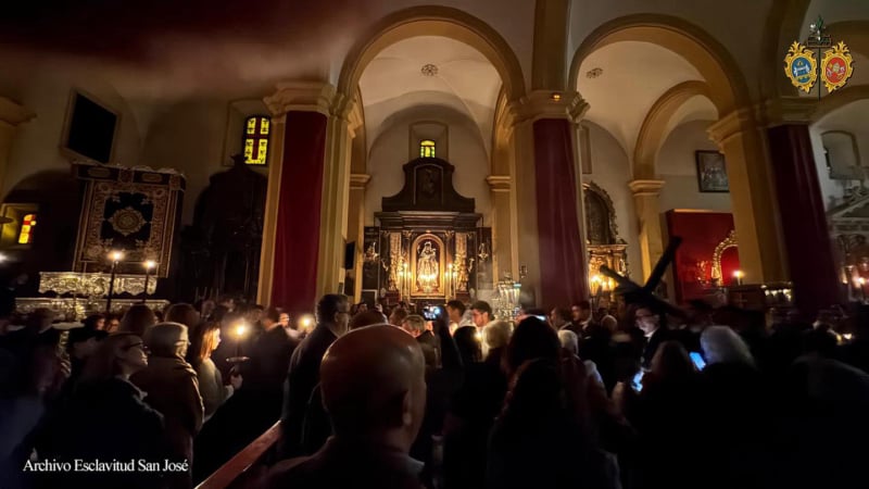 Seguidamente, durante el tradicional traslado de Jesús Nazareno, Regidor Perpetuo, como cada III Domingo de Cuaresma, la imagen del Nazareno se acercó hasta el altar del Patrón, solo iluminado con la cera, un precioso gesto de nuestra querida Cofradía del Nazareno que un año más visibiliza la cercanía de Jesús con el que es su Padre y Custodio del Redentor en la Tierra.