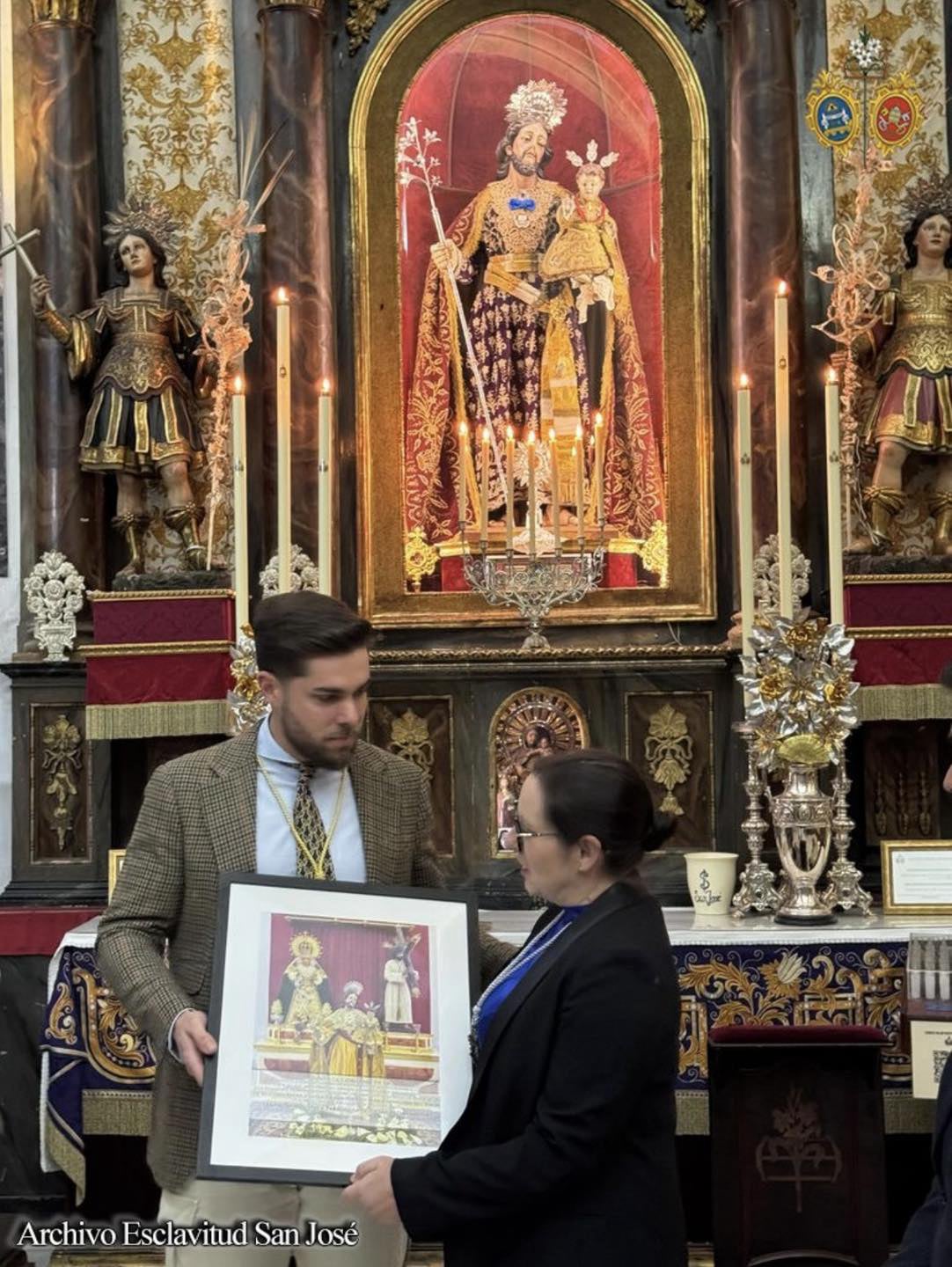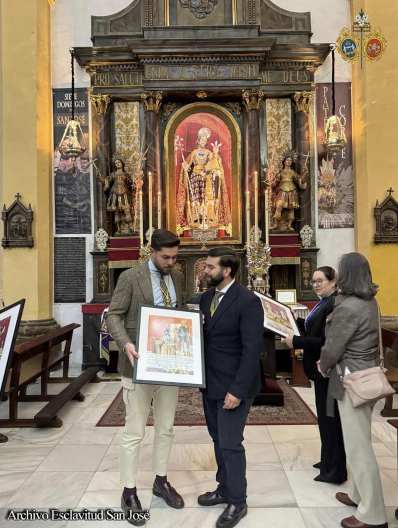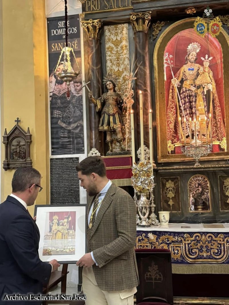 Tras el canto del Himno a San José, nuestro Hermano Mayor, D. Alberto de Hoyos Rodríguez, entregó un detalle a las hermandades invitadas que consistió en una fotografía enmarcada del Patrón ante los titulares de cada una de las corporaciones durante la estancia del Patrón en la Sagrada Familia con motivo de la celebración del CCXXV Aniversario del Voto y Patronazgo de San José el pasado año, instantáneas que fueron tomadas antes de que que Patrón fuera entronizado en su paso en la parroquia de la Bazán y agradeciendo con ello la extraordinaria acogida de las tres hermandades al Patrón aquellas jornadas históricas.