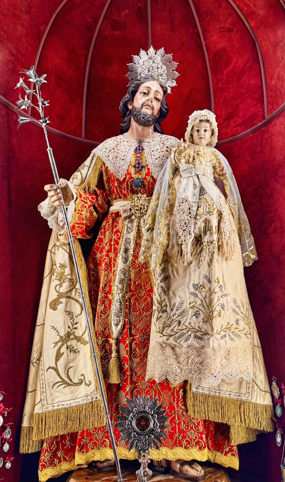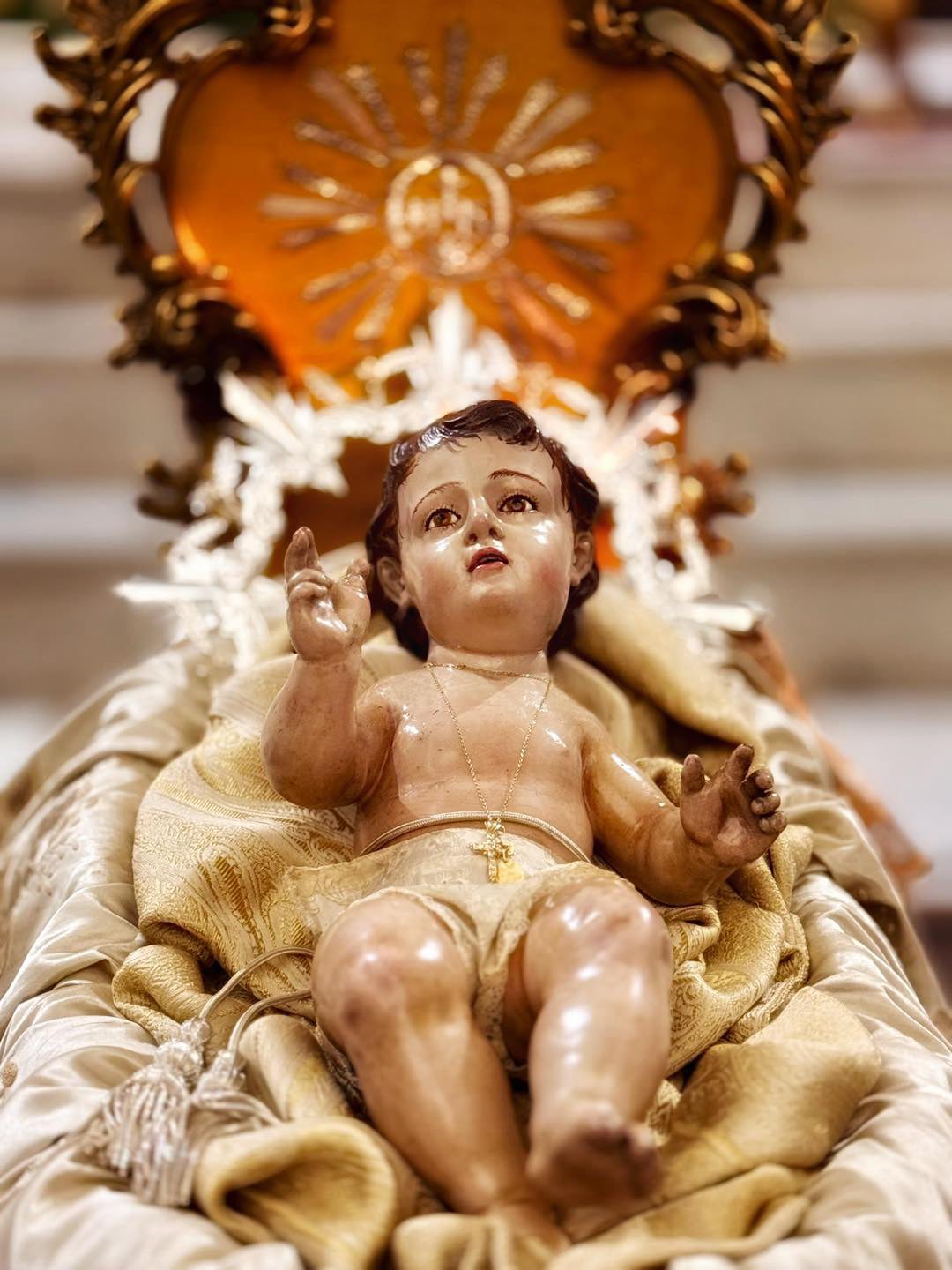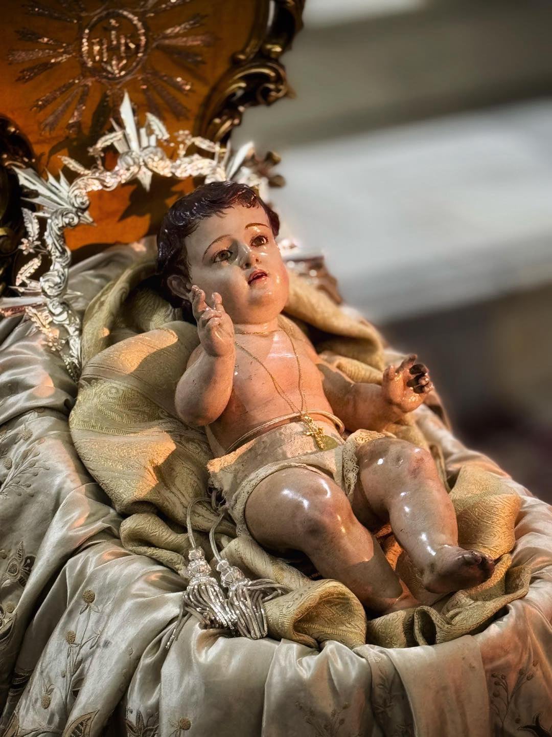 Tras la celebración religiosa, el Bendito Niño Jesús volvió de nuevo a los brazos del Patrón ya vestido, como es tradición, con uno de sus valiosos batones de recién nacido.
